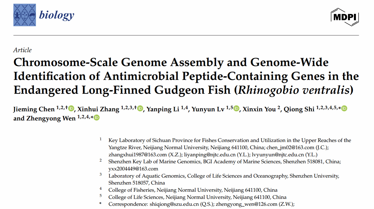 2025年10月24日,重点实验室教师文正勇副教授以通讯作者身份在中国科学院SCI二区期刊《Biology》上在线发表一篇题为《Chromosome-Scale Genome Assembly and Genome-Wide Identification of Antimicrobial Peptide-Containing Genes in the Endangered Long-Finned Gudgeon Fish (Rhinogobio ventralis)》的研究论文,重点实验室教师李燕平副教授和吕云云副教授参与了该项研究。