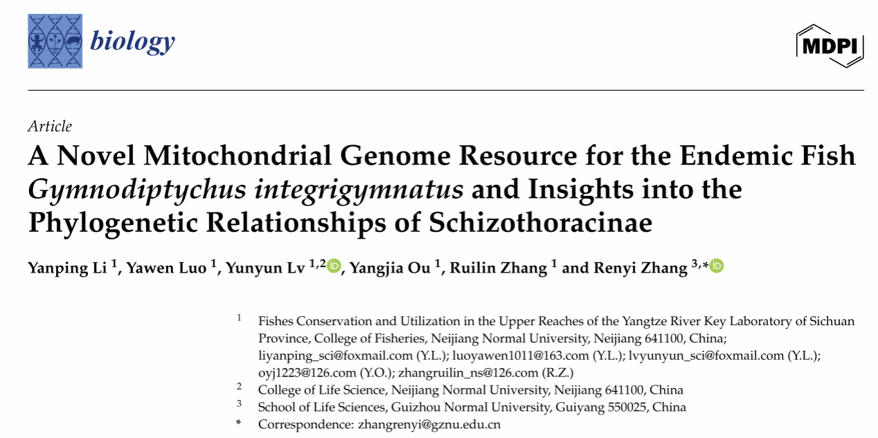 2025年12月9日,重点实验室成员李燕平与贵州师范大学张仁意教授合作,在中国科学院SCI二区《Biology》上发表研究论文。论文题为《A Novel Mitochondrial Genome Resource for the Endemic Fish Gymnodiptychus integrigymnatus and Insights into the Phylogenetic Relationships of Schizothoracinae》。
