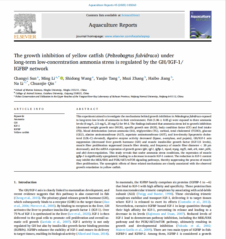 11月28日,重点实验室教师李娜博士联合宁波大学黎明教授以共同通讯作者身份,在中国科学院SCI二区期刊《Aquaculture Reports》上在线发表一篇题为《The growth inhibition of yellow catfish (Pelteobagrus fulvidraco) under long-term low-concentration ammonia stress is regulated by the GH/IGF-1/ IGFBP network》的研究论文。