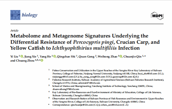 2025年11月4日,重点实验室教师刘乙与四川大学博士后周闯合作在中国科学院SCI二区《Biology》上发表研究论文。论文题为《Metabolome and Metagenome Signatures Underlying the Differential Resistance of Percocypris pingi, Crucian Carp, and Yellow Catfish to Ichthyophthirius multifiliis Infection》。