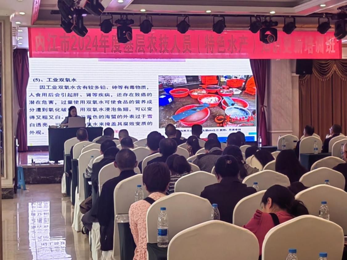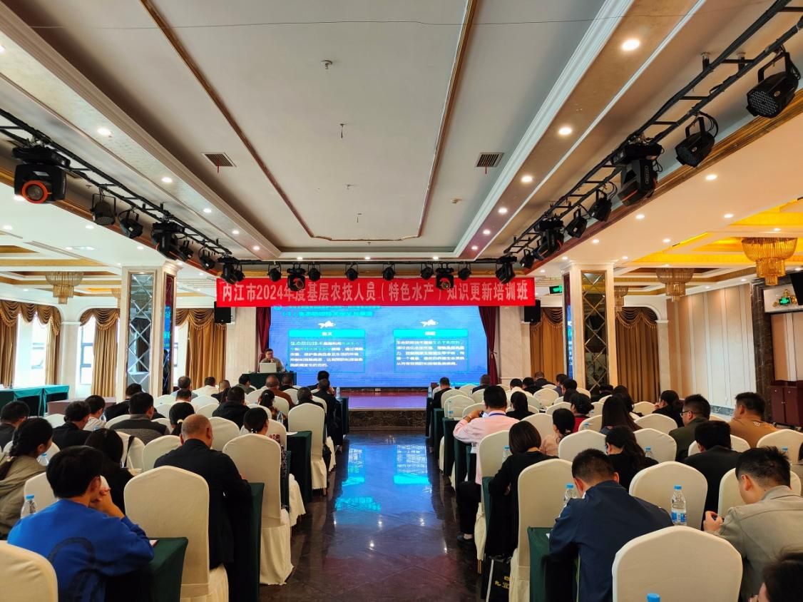 2024年10月9日,由内江市水产技术推广站主办的“内江市2024年度基层农技人员(特色水产)知识更新培训班”在内江市甜城国际酒店召开。此次培训班参加学员共110人,我室成员王均博士为广大学员做了题为“养殖鱼类疾病生态防控技术”的技术培训,为基层农技人员分享了鱼类疾病生态防控的概念、原理和方法等内容,并指出生态防控对水产品质量安全和水环境保护的重要意义。贺扬博士为广大学员做了题为“水产品营养与安全”的技术培训,介绍了水产品对人类健康的重要性,同时也提出当前存在的水产品安全问题和案例,并提出如何区分有问题的水产品。培训内容生动实用,学员反馈良好。