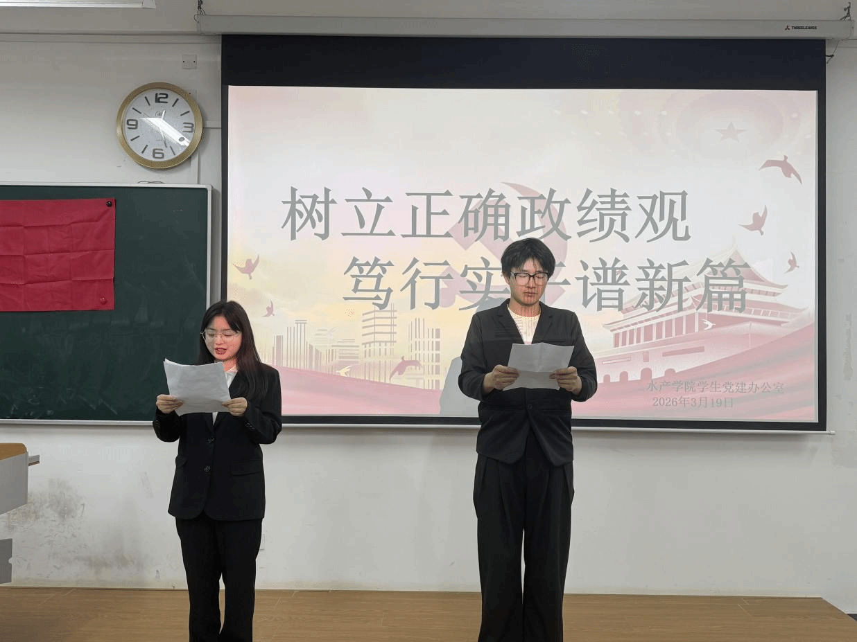 3 月 19 日,水产学院学生党支部于明德楼 B103 开展 “树立正确政绩观,笃行实干谱新篇” 主题党日活动。本次活动以深入学习贯彻习近平新时代中国特色社会主义思想为核心,全面落实党的二十大和二十届历次全会精神,专题学习习近平总书记关于树立和践行正确政绩观的重要论述,引导党员坚定理想信念、强化实干担当。